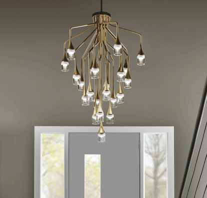 “Sophisticated and undeniably beautiful, 22 precisely executed metal stems each bear a sleek crystal shade illuminated by a gently diffused LED in this new Patrona suspension by Tech Lighting. The stems form tiers which taper at varying angles and lengths to create a stunning, modern interpretationof the classic crystal chandelier.” – Tech Lighting