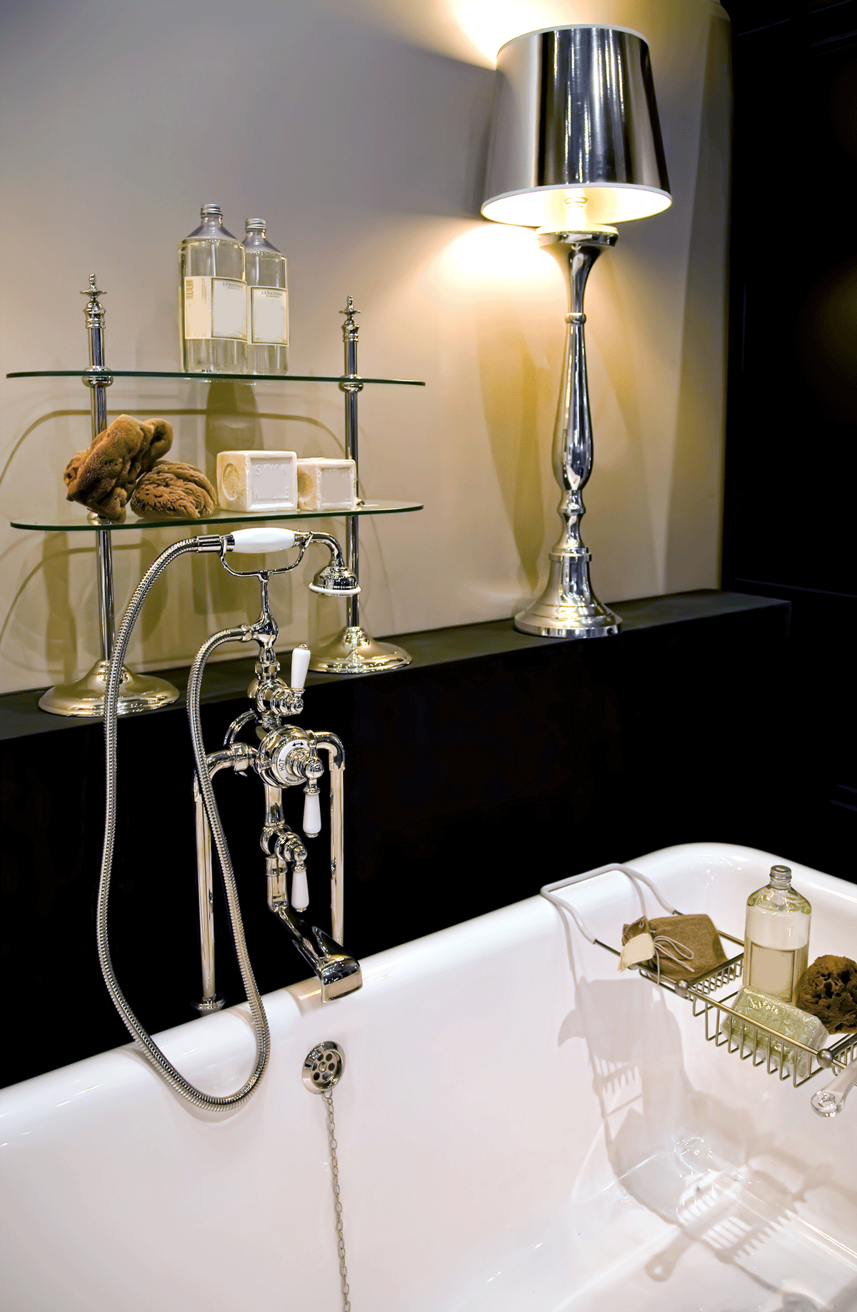This photo, as stylish as it is, does have the table lamp too close to the tub for comfort. Think safety, too, and only use additional lights far away from water. But it shows that you can be creative with the lighting in your bathroom. Think outside the box!